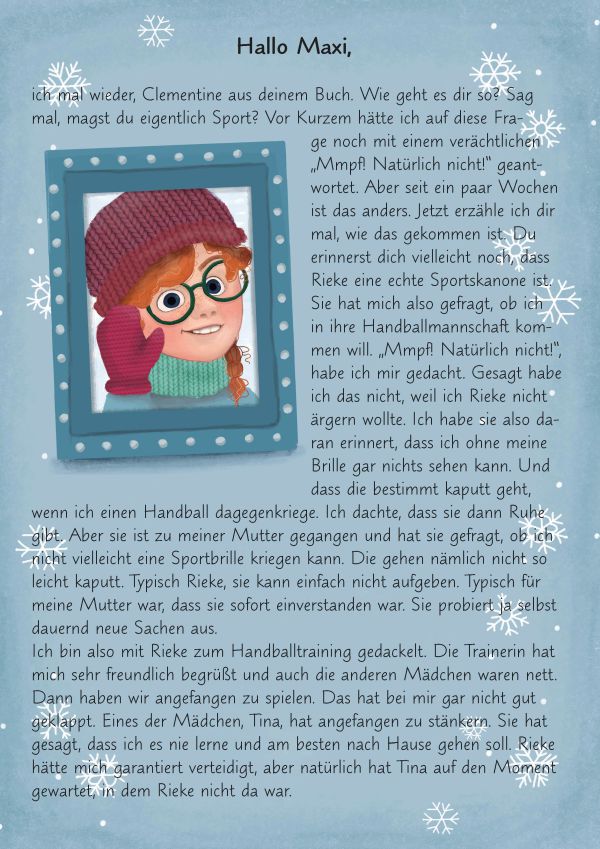 ich mal wieder, Clementine aus deinem Buch. Wie geht es dir so? Sag mal, magst du eigentlich Sport? Vor Kurzem hätte ich auf diese Frage noch mit einem verächtlichen „Mmpf! Natürlich nicht!“ geantwortet. Aber seit ein paar Wochen ist das anders. Jetzt erzähle ich dir mal, wie das gekommen ist. Du erinnerst dich vielleicht noch, dass Rieke eine echte Sportskanone ist. Sie hat mich also gefragt, ob ich in ihre Handballmannschaft kommen will. „Mmpf! Natürlich nicht!“, habe ich mir gedacht. Gesagt habe ich das nicht, weil ich Rieke nicht ärgern wollte. Ich habe sie also daran erinnert, dass ich ohne meine Brille gar nichts sehen kann. Und dass die bestimmt kaputt geht, wenn ich einen Handball dagegenkriege. Ich dachte, dass sie dann Ruhe gibt. Aber sie ist zu meiner Mutter gegangen und hat sie gefragt, ob ich nicht vielleicht eine Sportbrille kriegen kann. Die gehen nämlich nicht so leicht kaputt. Typisch Rieke, sie kann einfach nicht aufgeben. Typisch für meine Mutter war, dass sie sofort einverstanden war. Sie probiert ja selbst dauernd neue Sachen aus.
