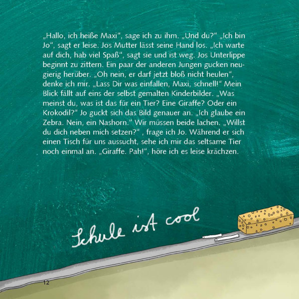 "Hallo, ich heiße Maxi", sage ich zu ihm. "Und du?" "Ich bin Jo", sagt er leise. Jos Mutter lässt seine Hand los. "Ich warte auf dich, hab viel Spaß", sagt sie und ist weg. Jos Unterlippe beginnt zu zittern. Ein paar der anderen jungen gucken neugierig herüber. "Oh nein, er darf jetzt bloß nicht heulen", denke ich mir. "Lass dir was einfallen, Maxi, schnell!" Mein Blick fällt auf eins der selbstgemalten Kinderbilder. "Was meinst du, was ist das für ein Tier? Eine Giraffe? Oder ein Krokodil?" Jo guckt sich das Bild genauer an. "Ich glaube ein Zebra. Nein, ein Nashorn." Wir müssen beide lachen. "Willst du dich neben mich setzen?", frage ich Jo. Während er sich einen Tisch für uns aussucht, sehe ich mir das seltsame Tier noch einmal an. "Giraffe. Pah!", höre ich es leise krächzen.