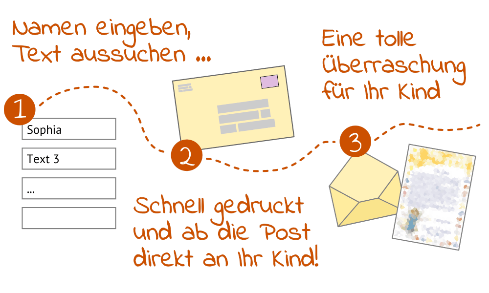Ihr Kind bekommt einen ganz persönlichen Brief an die eigene Adresse geschickt. Die Texte sind durchweg positiv formuliert und werden mit vielen personalisierten Angaben versehen. Diese Briefe bekommen Sie nur hier! Briefe im Direktversand sind versandkostenfrei!